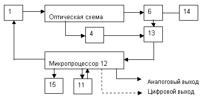 1 - ксеноновая лампа - источник света канала возбуждения; Функциональная схема работы сигнализатора (рис.2): импульсный источник света 1 под управлением микропроцессора 12 вырабатывает световые импульсы, интенсивность которых при проходе через оптическую схему контролируется фотоприемником опорного канала 4 с помощью блока регистрации 13. Попадая через оптическую систему и торцы 7, 9 световода в водную среду, эти импульсы возбуждают импульсы люминесценции, величина которых пропорциональна концентрации растворенных и эмульгированных нефтепродуктов. Импульсы люминесценции проходят из водной среды через торцы 9, 8 световода в обратном направлении и измеряются фотоприемником канала регистрации - ФЭУ 6 при помощи блока регистрации 13 и обрабатываются микропроцессором 12. Микропроцессор через блок реле 15 управляет вторичными устройствами (задвижками, клапанами, сигнализацией) и передает информацию на блок индикации 11, аналоговый и/или цифровой выходы. Высоковольтный источник питания 14 вырабатывает напряжение для питания ФЭУ. Все электронные схемы сигнализатора используют низковольтный источник питания (на схеме не показан), преобразующий переменное напряжение сети 220 В в постоянное стабилизированное напряжение (+5В, +12В, +15В, -15В). Рис.2. Функциональная схема сигнализатора![]() Блок индикации (11) служит для: